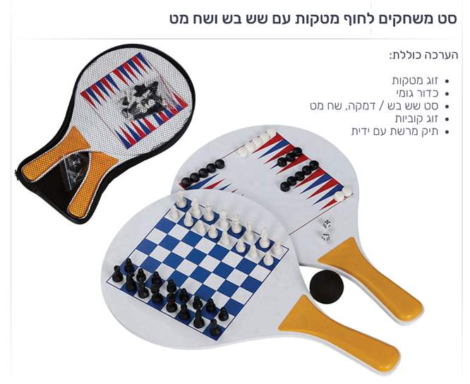 ים, מטקות מעץ עם כדור קוטר 23 ס"מ                                                                   מטקות + 4 משחקים: שח מט, דמקה, שש בש, דילוגים . עובי 8 מ"מ ידית סופגת זיעה                          סקווש, זוג מטקות עם משחק שש-בש ושחמט בתיק נשיאה                                                          מטי, זוג מטקות איכתיות מעץ עם כדור                                                                       סט מטקות עם כדור ומשחקים מודפסים על גב המטקות עם חיילי משיק וקוביות בתיק נשיאה