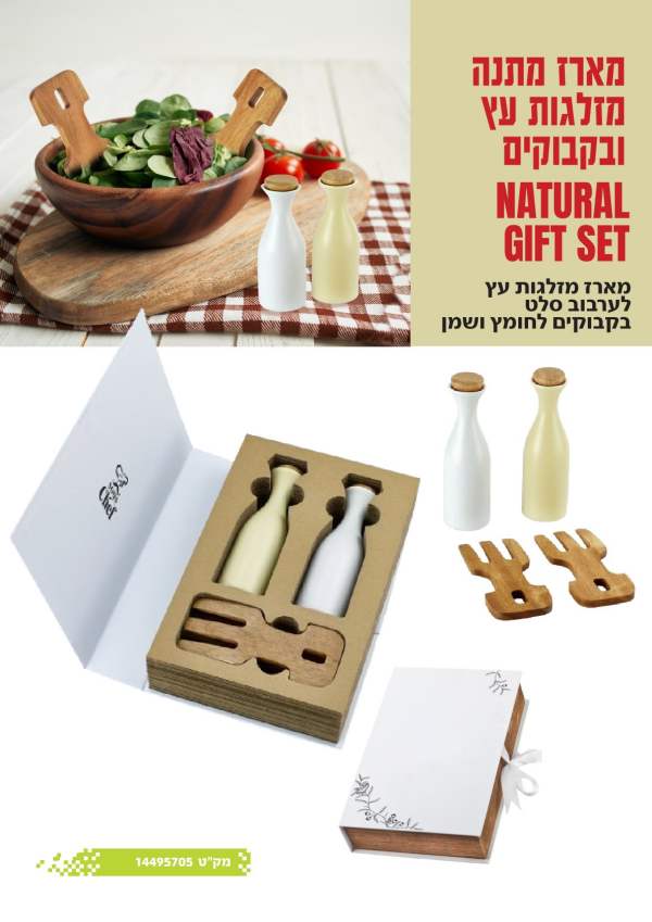 מארז מתנה מזלגות עץ ובקבוקים לערבוב סלט בקבוקים לחומץ ושמן