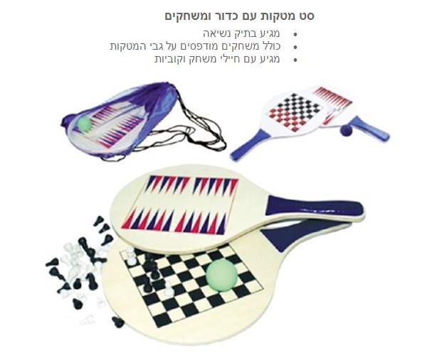 ים, מטקות מעץ עם כדור קוטר 23 ס"מ                                                                   סט מטקות שחמט ושש בש                                                                                     מטקות + 4 משחקים: שח מט, דמקה, שש בש, דילוגים . עובי 8 מ"מ ידית סופגת זיעה                          סקווש, זוג מטקות עם משחק שש-בש ושחמט בתיק נשיאה                                                          מטי, זוג מטקות איכתיות מעץ עם כדור